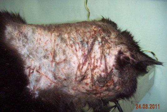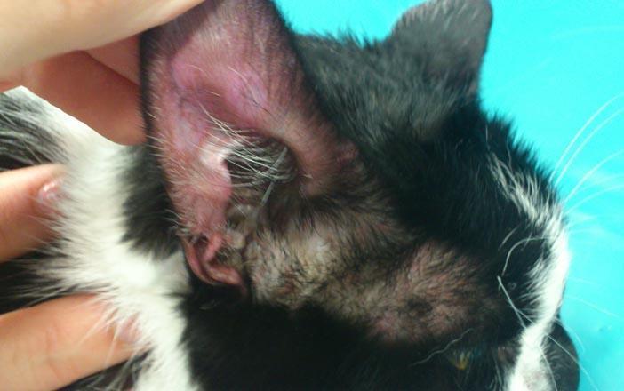 - felina simetrična alopecija (mačke si lajšajo srbež z intenzivnim lizanjem, pri čemer si s hrapavim jezičkom pobrijejo vso dlako okoli trebuha, po boku, stegnih, zadnjika in repa; koža je na teh mestih pordela in vneta);