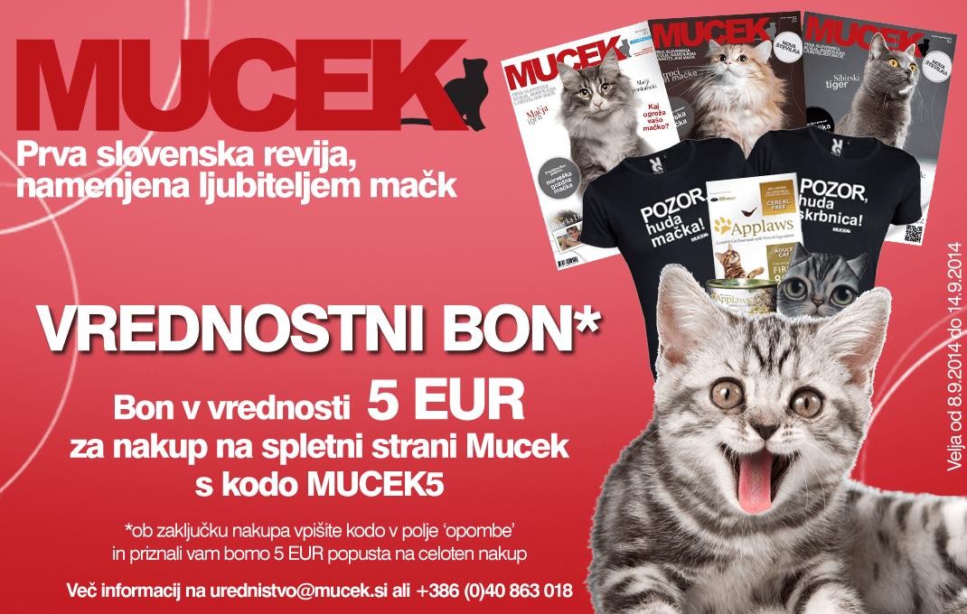 Vsem našim zvestim bralkam in bralcem smo tokrat pripravili poseben popust v obliki vrednostnega bona za 5€, ki ga lahko izkoristite ob nakupu katerih koli izdelkov v spletni trgovini na www.mucek.si v skupni vrednosti nad 20€.