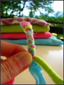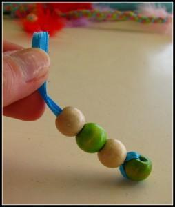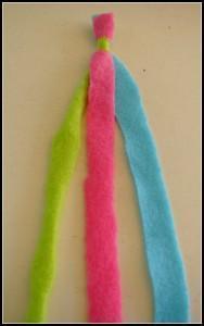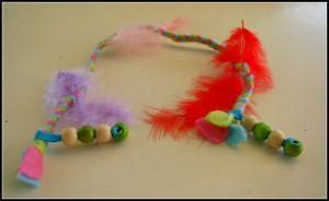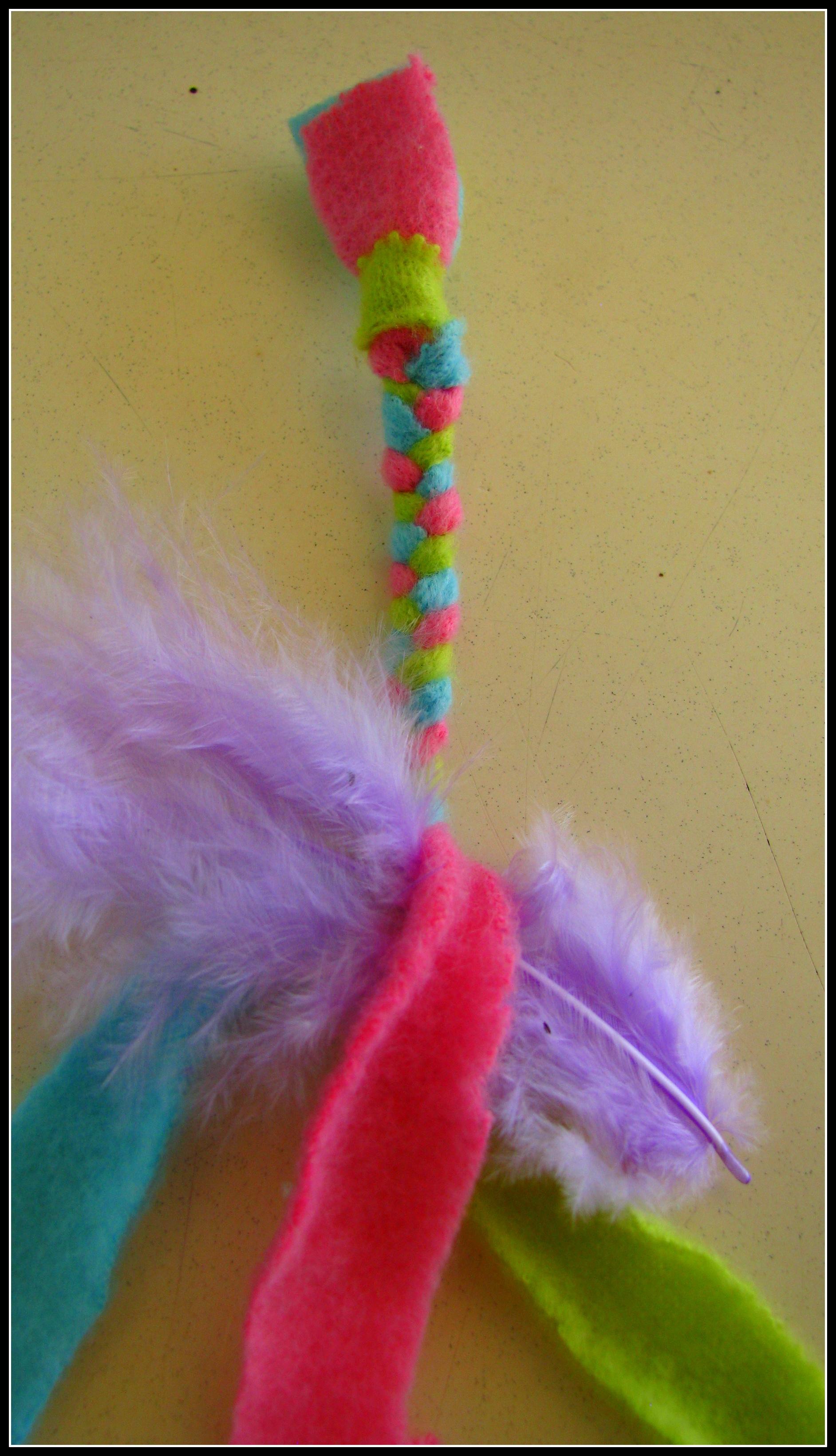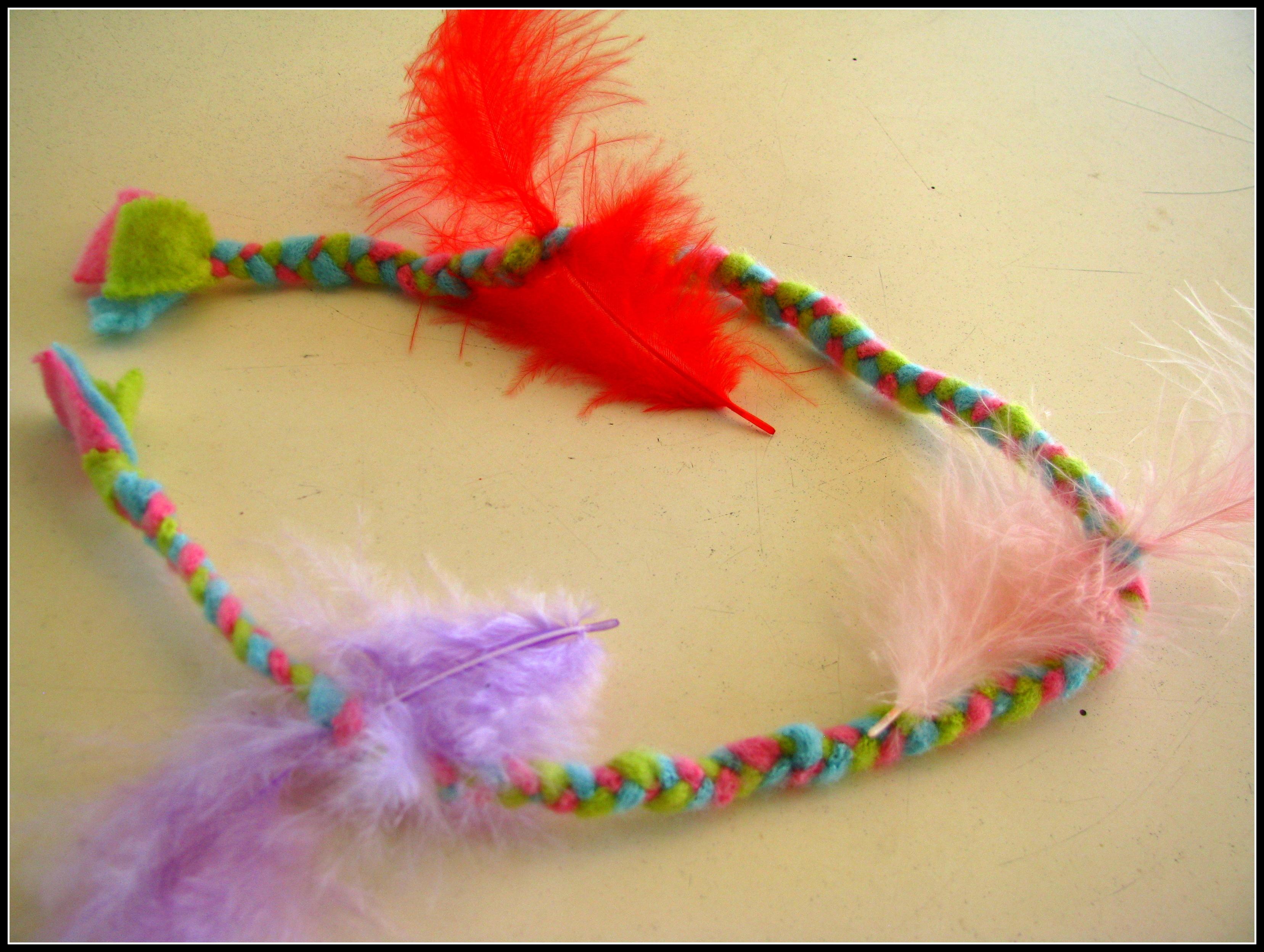 Flis narežemo na centimeter debele in dolge trakove. Za izdelavo potrebujemo tri pisane trakove, ki jih na vrhu zvežemo. Trakove prepletamo v kitko, ki naj bo narejena čim bolj trdno, da igračka ne razpade že ob prvem srečanju z muckom. Po želji dodajamo peresa, ki popestrijo igračo in jo naredijo še bolj zanimivo. Pri tem pazimo, da jih res trdno vpletemo v kitko, da bo igračka ostala aktualna dlje časa, igra našega kosmatinčka pa nepozabna. Število peres je odvisno od dolžine kitke. Po navadi damo vanjo dva ali tri peresa. Na koncu lahko dodamo tudi trakove z lesenimi perlami. Tudi slednji so lahko zelo zanimivi za vašega mačkona, saj se bo ob njih zagotovo prav prijetno zabaval, medtem ko vas ne bo doma.
