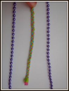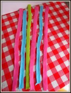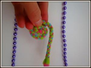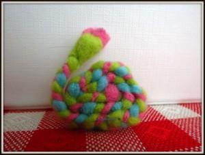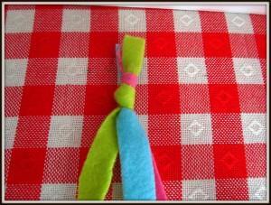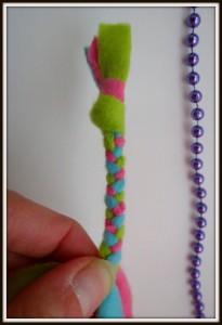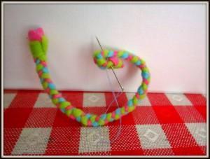 Flis narežemo na trakove, debeline en centimeter in poljubne dolžine (dolžina je odvisna od tega, kako velikega polžka želimo narediti) (Slika 2). Tri enako dolge trakove povežemo skupaj in začnemo s pletenjem kitke (Sliki 3 in 4). Pri koncu naredimo enak vozel, kot smo ga na začetku, ostanek pa odrežemo stran (Slika 5). Narejeno kitko začnemo ovijati v strukturo polžkove hišice (Slika 6), pri tem pa si pomagamo s šivanko in nitjo (Slika 7). Vse skupaj trdno povijemo in zašijemo tako, da se nam polžek ne odvije nazaj (Slika 8). Približno en centimeter kitke pustimo neprišite, saj bo služila kot polžja glava, na katero lahko narišemo oči, nos in usta (Slika 9).
